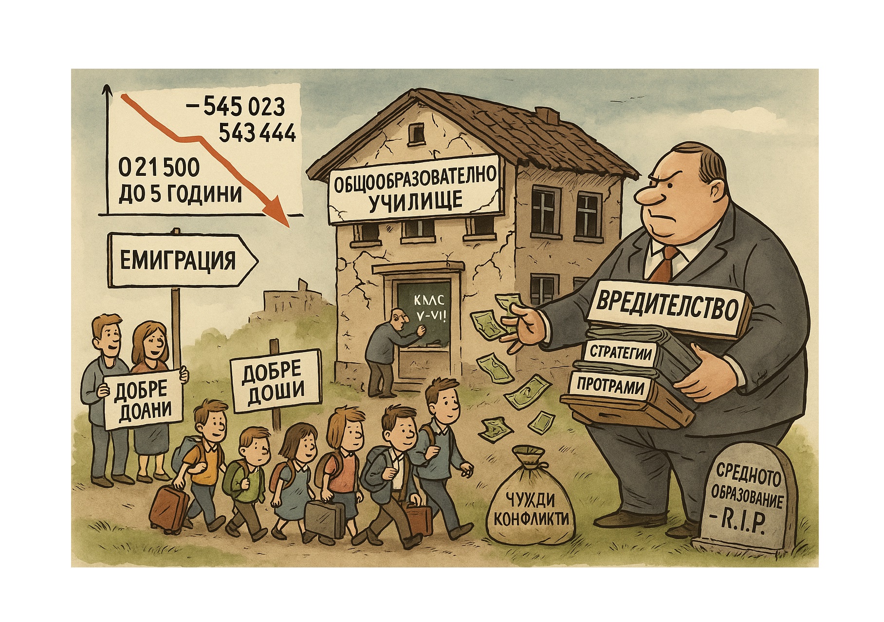 - ВРЕДИТЕЛСТВОТО бездейства, докато училища в малките населени места се затварят, класните стаи се обезлюдяват, а учителският недостиг става хроничен. Всяка година десетки хиляди деца отпадат от системата, а държавата не предприема решителни мерки да ги върне.