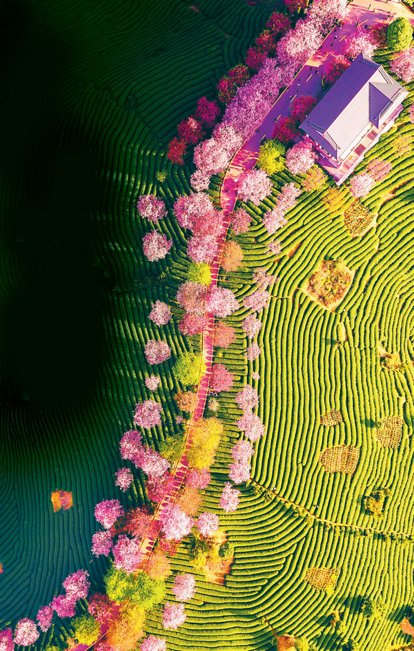 Чаени плантации и цъфтящи черешови цветове украсяват планински район в Лонгян, провинция Фудзиен. [Photo provided to China Daily]
