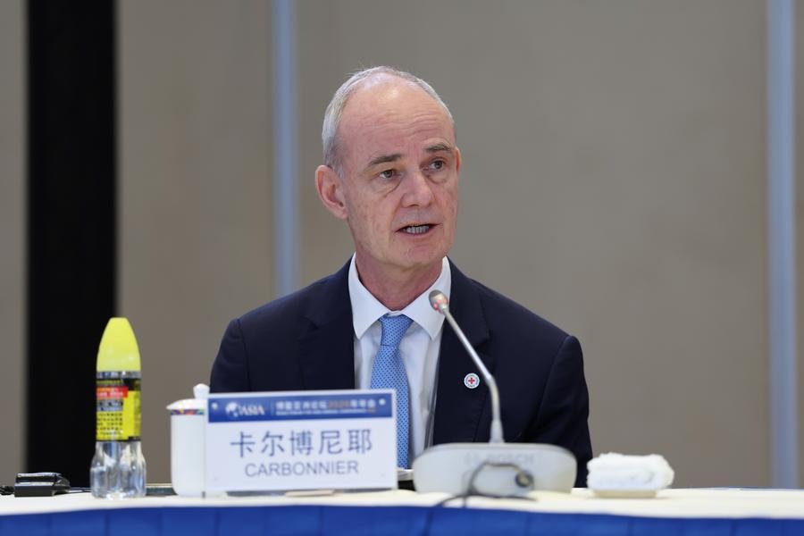 Жил Карбоние, вицепрезидент на Международния комитет на Червения кръст (МКЧК), говори на панелна дискусия на тема „Напредък на ЦУР: Действия отвъд ангажиментите“ по време на годишната конференция на форума Боао за Азия (BFA) 2026 г. в Боао, провинция Хайнан в Южен Китай, 25 март 2026 г. [Photo/Xinhua]