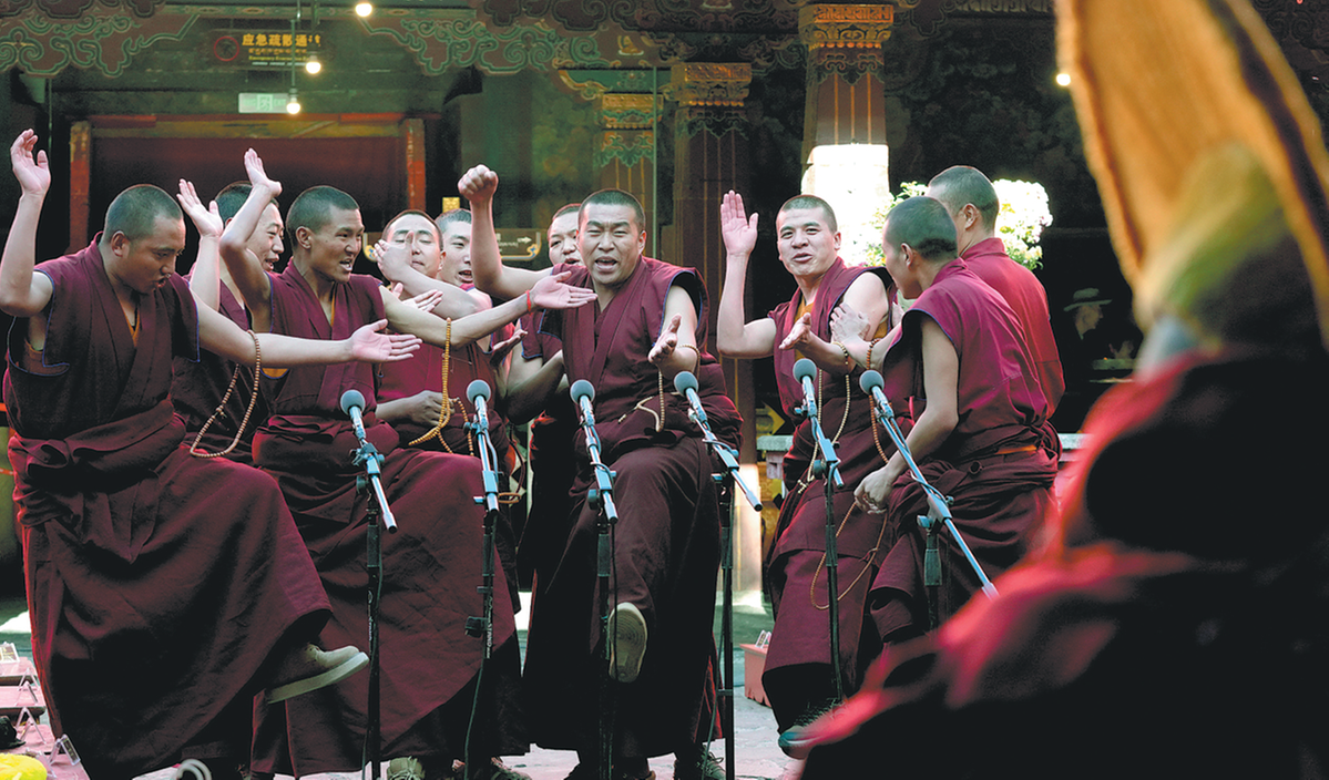 Монаси дебатират кандидатите върху пет класически текста по време на изпита за Geshe Lharampa в храма Jokhang в Лхаса, автономен регион Xizang, в неделя. Тринадесет монаси спечелиха най-високата академична степен на училището Гелук тази година, с което общият брой на получателите стана 215. LI LIN/CHINA NEWS SERVICE