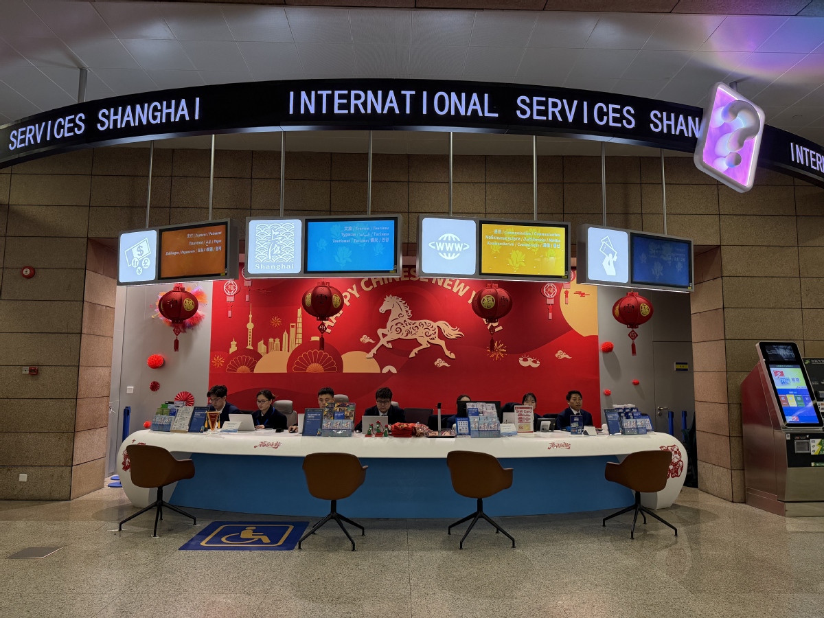 Тематичен за пролетния фестивал международен център за обслужване на едно гише на терминал 1 на международното летище Shanghai Pudong. [Photo by Li Junfeng/chinadaily.com.cn] Международното летище Shanghai Pudong добави оживена нотка на традиционен празник към своите оживени терминали в четвъртък, тъй като неговите две международни бензиностанции на едно гише бяха домакини на флаш тълпи по темата…